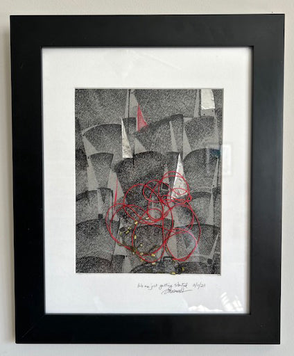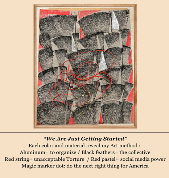 Description: We are Just Getting Started is a multi-media artwork piece. Each color and material reveals the Art method: Aluminum ~ to organize / Black feathers ~ the collective